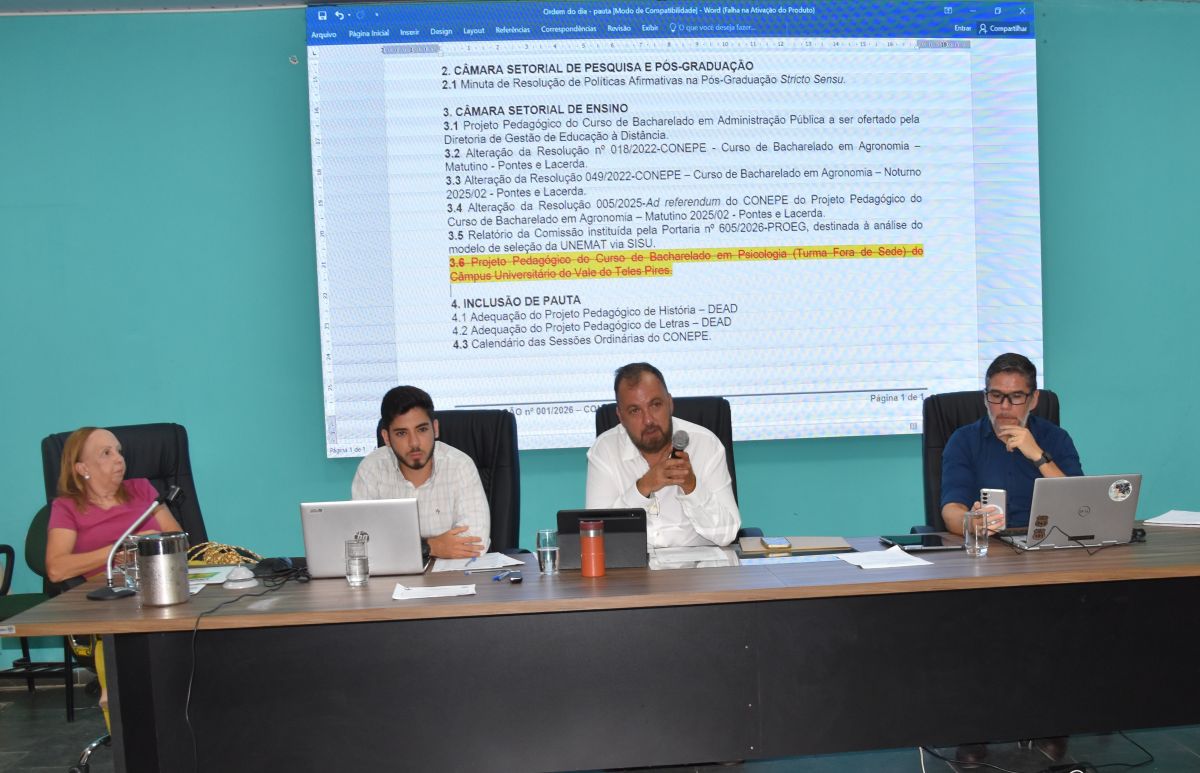 Os representantes da comunidade acadêmica também aprovaram os projetos pedagógicos do curso de Administração Pública, História e Letras ofertados pela Diretoria de Gestão de Educação a Distância (Dead) e alteraram resoluções das turmas especiais de oferta única de Agronomia em Pontes e Lacerda.