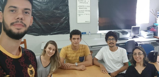 A pró-reitora esteve reunida com o vice-presidente da Filos, Leonardo Mendonça, com o diretor de Projetos, Humberto Hauser, e os membros da empresa júnior, Rafaela Rosso e Thalysson Pacheco.