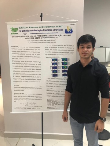 Lucas é aluno do Curso de Bacharelado em Ciência da Computação do Núcleo Pedagógico da Unemat em Rondonópolis, que é vinculado ao Câmpus Universitário de Alto Araguaia, e também bolsista do Conselho Nacional de Desenvolvimento Científico e Tecnológico - CNPq desde outubro de 2018. Sob a orientação do professor dr. Caio Cesar Enside de Abreu o bolsista apresentou trabalho intitulado " O Uso do Descritor Hog no Problema da Classificação de Cenas Acústicas sobre o Domínio Wavelet" na categoria Artigo Curto.