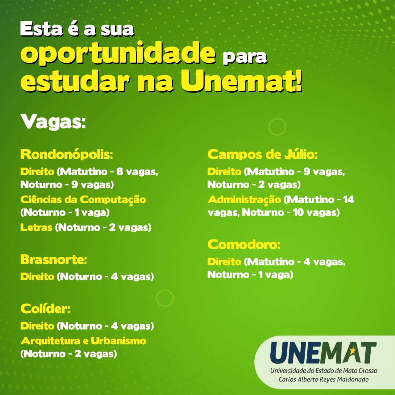 Rondonópolis: Direito (matutino e noturno), Ciências da Computação e Letras. Brasnorte: Direito. Colíder: Direito, Arquitetura e Urbanismo. Campos de Júlio: Direito (matutino e noturno) e Administração. Comodoro: Direito (matutino e noturno). Veja abaixo quadro de vagas.